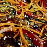 Обжарить до золотистой корочки на масле ( у меня оливковое ). Морковь на терку, перец тонко режем , лук ( у меня крымский ) полукольцами . Зелень по вкусу . Кунжут слегка обжарил. Чеснок через пресс . Смешиваем . Остатками масла заливаем в салат . Пару часов настояться , можно упортреблять .